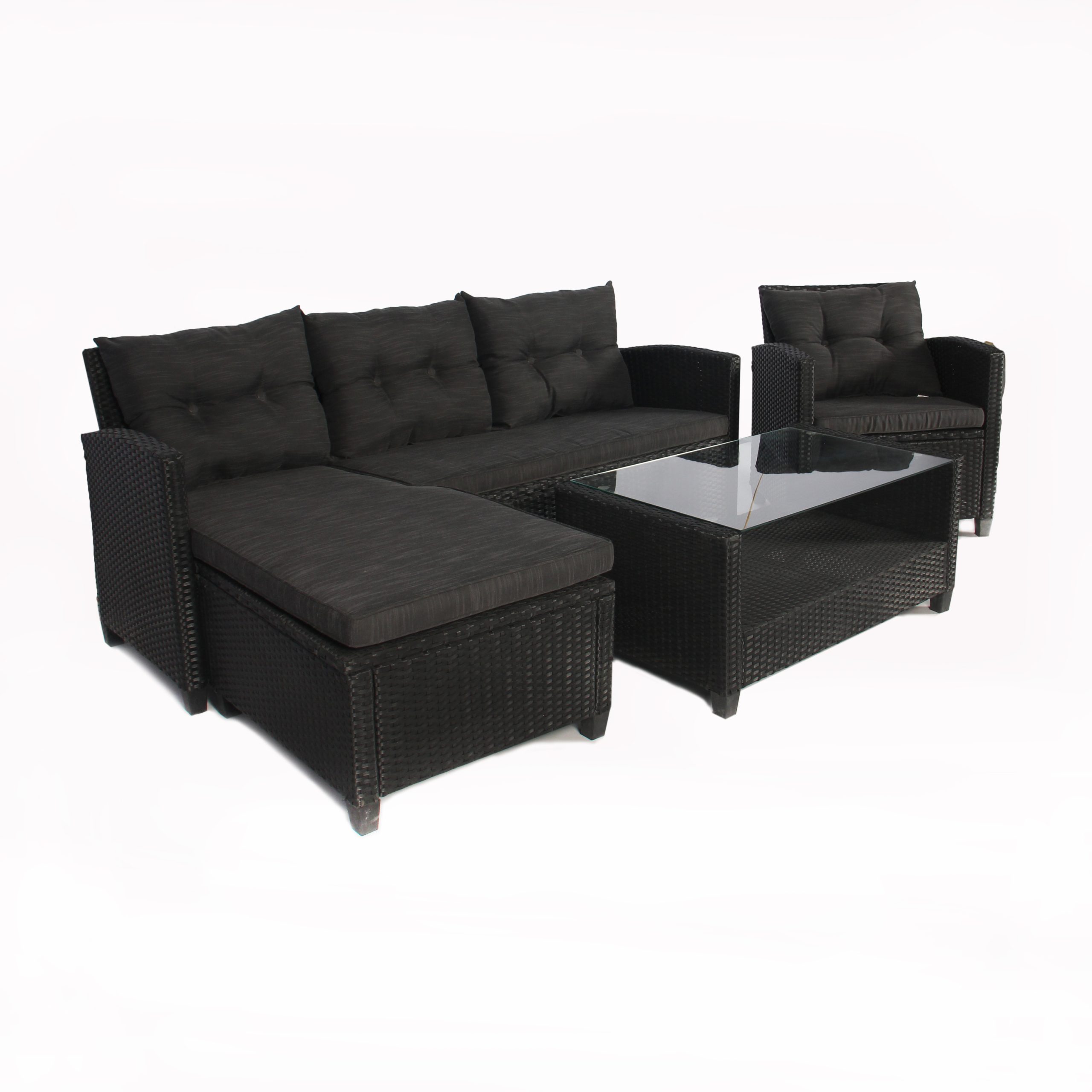 Designed to withstand the elements, the UV-resistant and water-resistant features make this black wicker patio furniture a reliable choice for any outdoor setting. The tempered glass table top adds a touch of sophistication to the ensemble, providing a practical and elegant surface for your beverages and snacks. Whether under the scorching sun or light rain, the Versailles Sectional remains resilient, ensuring your outdoor space is always ready for enjoyment